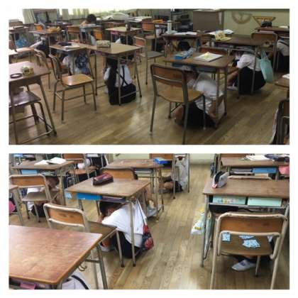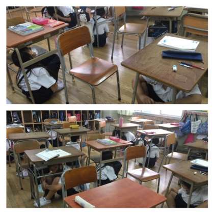 学校では、地震放送に備え、まず机の下にもぐる訓練をしました。