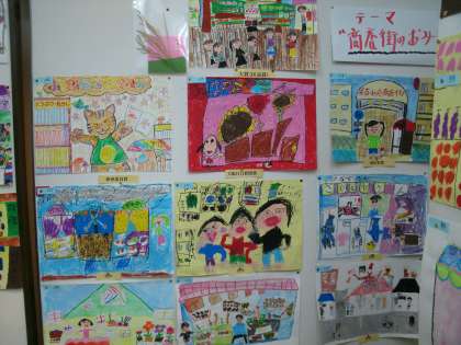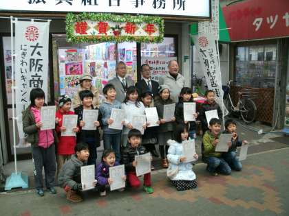 長吉中央商店街児童絵画作品展(主催:長吉中央商店街振興組合、後援大阪日日新聞)が1月8日〜12日に商店街の事務所で開催されました。今年のテーマは「商店街のおみせ」でした。本校の1〜3年生も応募しました。その結果9名が入選、1名が人気1番賞に選ばれました。その表彰式が12日に行われました。