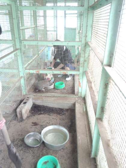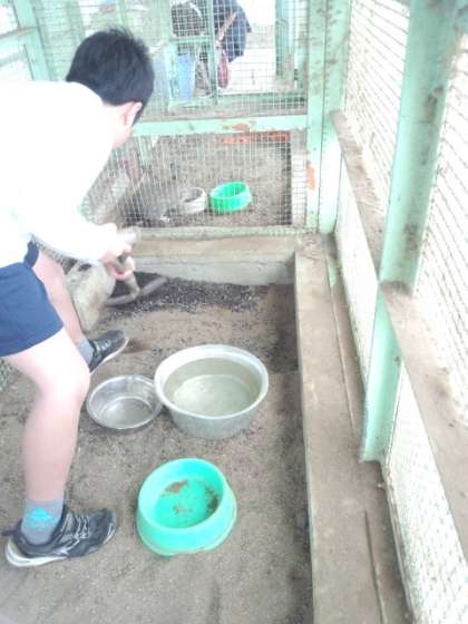 今日も飼育小屋の掃除をして、アダムとイブのエサの世話をするのは環境委員会の児童です。昼休みに自分たちが遊ぶ前にお世話をしています。今年は一度休み中にアダムが飼育小屋を出てしまいましたが、無事もどることができました。