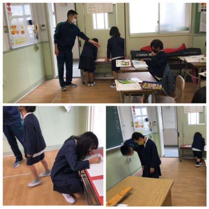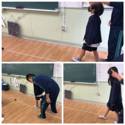 自分の歩幅を求めます。実際に教室で歩いて、測ってみました。その後ば計算をします。一歩はどれくらいだったかな?