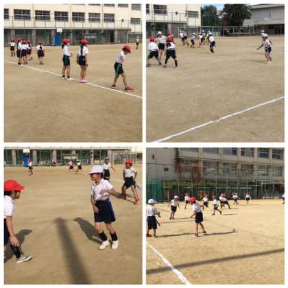 しっぽとりゲームをしています。ポカポカ陽気の中、みんな元気に走りまわっています