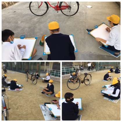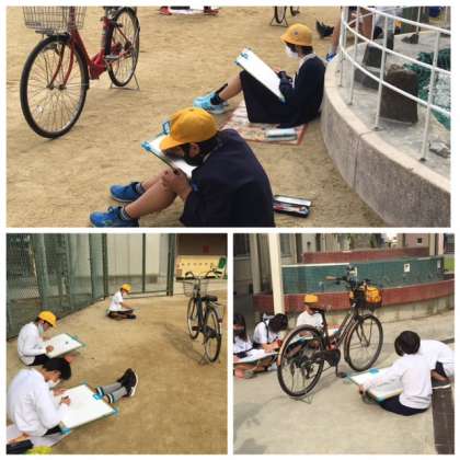 6年生も作品展に向けての取り組みをしています。さっきとは違うクラスです。先生の自転車の中から好きなものを選び、角度や向きを考えながら描いています。