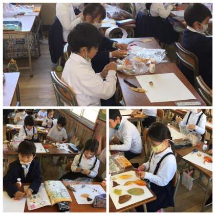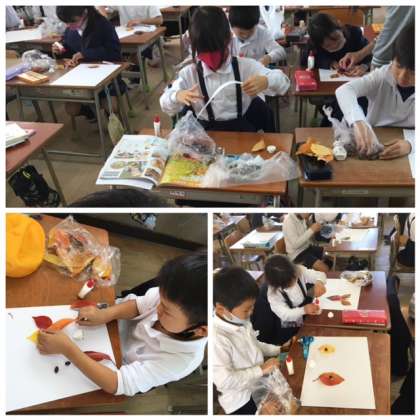 先日、遠足に行ったときに、久宝寺緑地で葉っぱやどんぐりを拾ってきました。