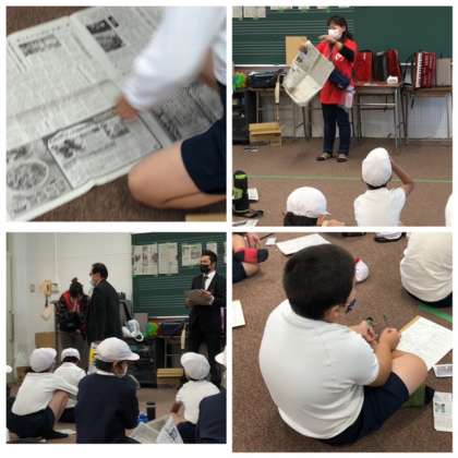 4年生は、防災クイズをしたあと、新聞紙でスリッパをつくります。