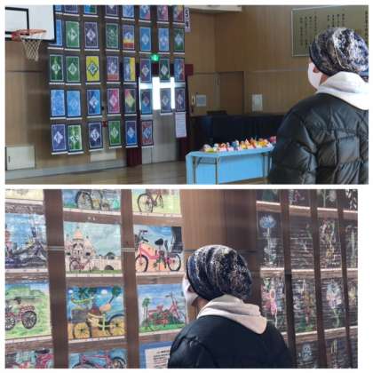 子どもたちの力作に感心しておられ、ほめてくださいました。一生懸命な子どもたちの様子が絵や工作から伝わったようです。一年生のペットボトリがおもしろいと話されてました。