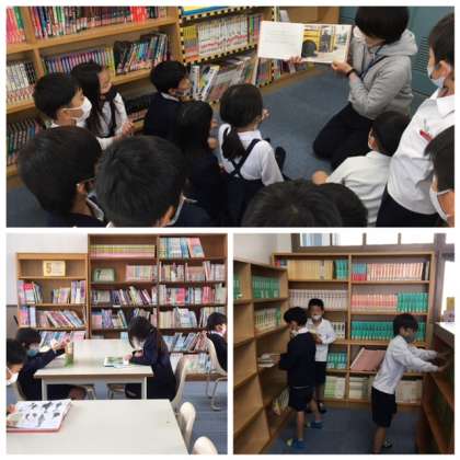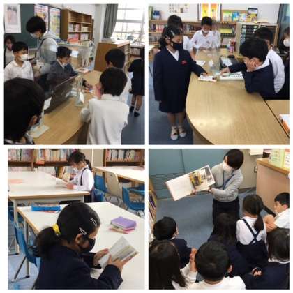 借りていた本を返し、また新しく借りる本を探しています。係の人がきちんと仕事をしていました。最後に、学校図書館補助員の先生に読み聞かせをしてもらいました。