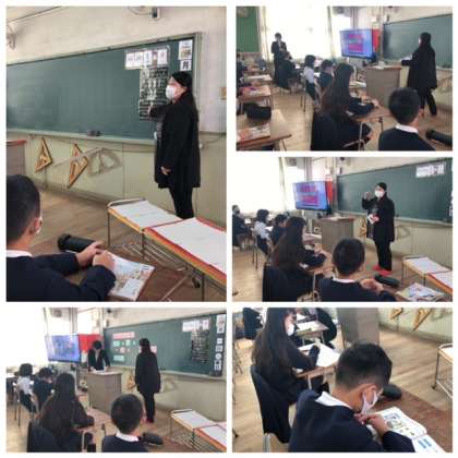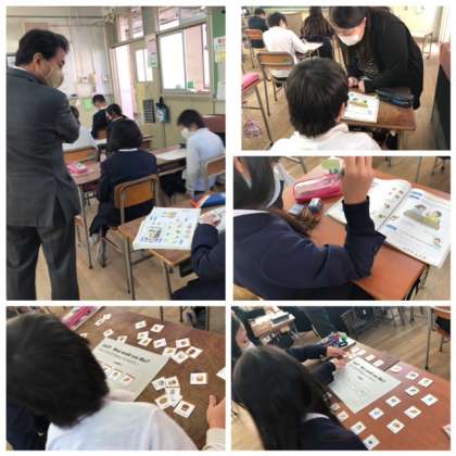 六反中学校の先生が小学校に来てくださって、外国語を子どもたちとともに学習をしています。その様子を、大阪市教育委員会から指導主事先生が見に来てくださいました。1時間目は5年生です。