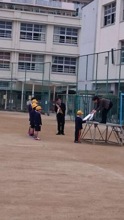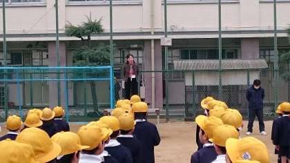 朝会時1年生はいつも早く並んでいます。今日は、2年生3年生の子どもたちも早い目に運動場に出ていました。