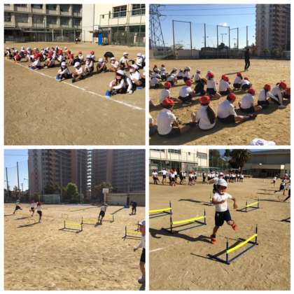 今日から、ハードルの学習です。きちんと並び、先生の話を聞いています。話を聞いた後は、ハードルを跳ぶ練習をしました。友だちが上手に跳んでいる姿を見て、拍手するお友だちもいました。