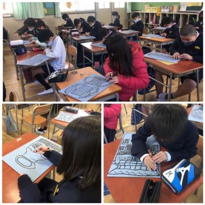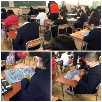 版画をしています。彫刻刀を使って一生懸命に彫っていました。