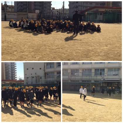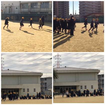 大阪地方に地震が来たという想定で、運動場へ避難し、その後、校舎の安全が確保され、津波警報が出たために、校舎の三階へ行きました。