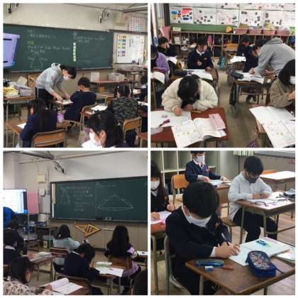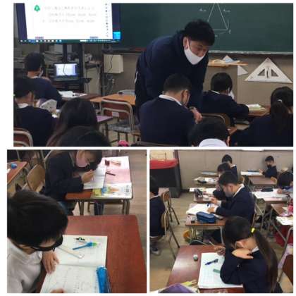 少人数に分かれて、学習をしています。今日は、コンパスを使って二等辺三角形の書き方を学びました。