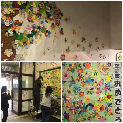 6年生の教室や廊下、玄関に飾りつけをしていきます。