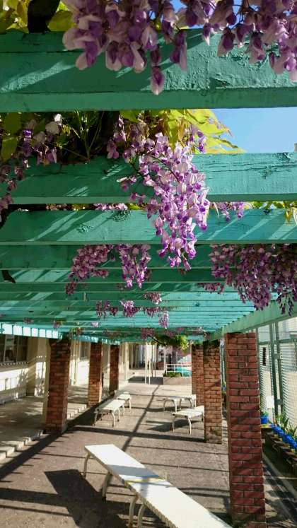 職員室前の藤棚は「藤色」と「白色」の2色の花が咲いています。