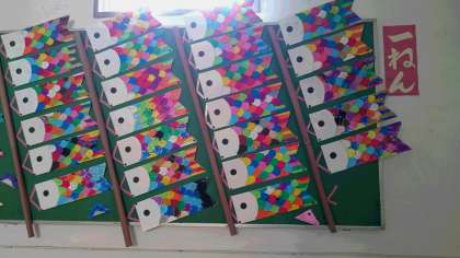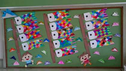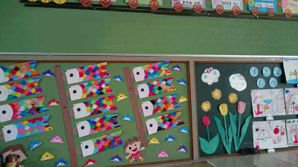 1年生の教室や廊下にはこいのぼりがいっぱい!入学して1か月がたちました。今日は遠足の説明を2年生と一緒に聞いています。