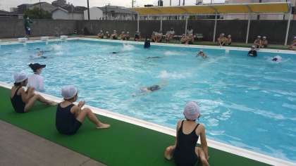 6年生の肩に1年生がつかまり、引っ張ってもらったり、6年生が上手に泳ぐ姿を見せてもらい、1年生が応援したりし、楽しく交流することができました。