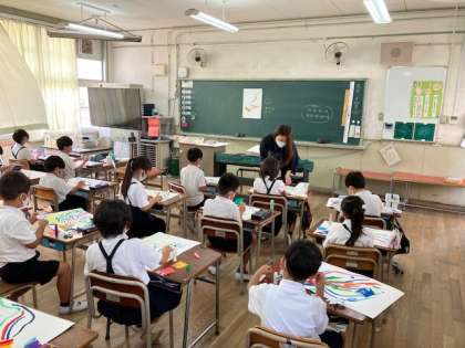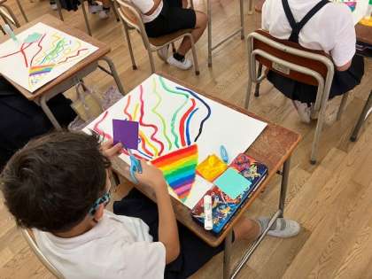 2年生の図画工作科では、「とびだせクラッカー」の題材でクラッカーを描いています。とびだしてくる紙の形も工夫し、作成していました。