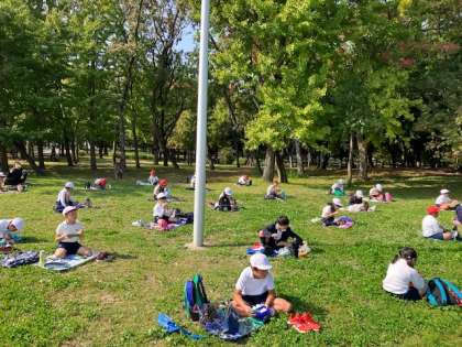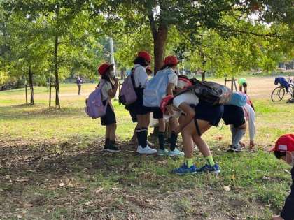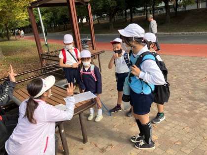 オリエンテーリング どんぐり拾い お弁当 の様子です