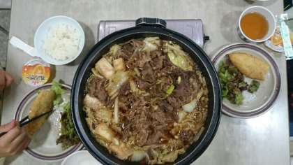 今晩のメニューは。すきやき。但馬牛です。自分たちでお鍋に入れていきます。