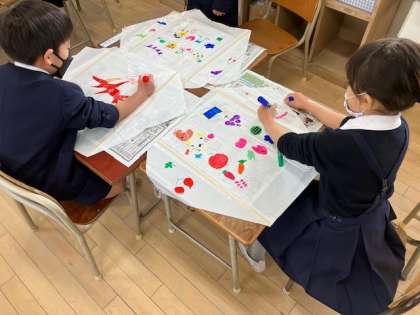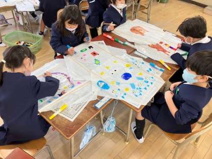凧あげの凧に、思い思いに絵を描いていました。
