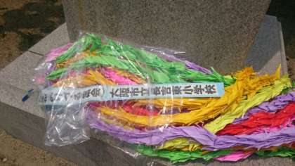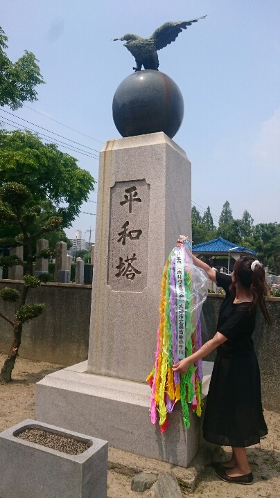 瓜破地区の方のご厚意で、瓜破霊園内にある平和塔の前に、万燈籠にあわせて、おりづるを奉納しました。