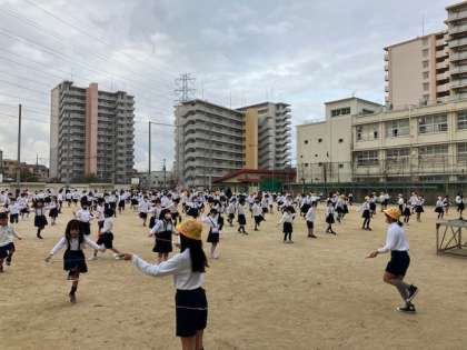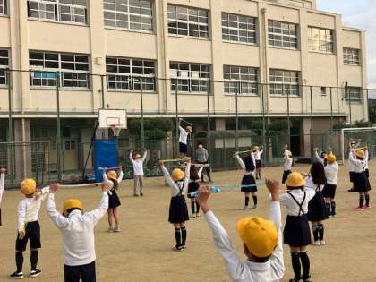 体育委員会の児童が見本になり、朝から元気に跳んでいます。