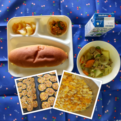 給食の「変わりピザ」は、ギョウザの皮に、具(ツナ・コーン・ピーマン・ピザソース・チーズを混ぜ合わせたもの)をのせ、焼きもの機で焼いています。