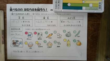 食べ物は、はたらきによって3つに分けることができることを教えていただき、そのあと、カレーの給食に使われている食材を3つに分けていました。