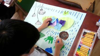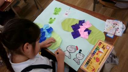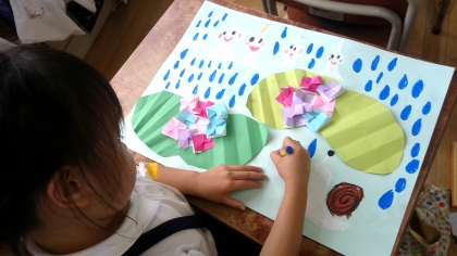 前に折り紙で作っていたあじさいの花びらを画用紙にはっていました。まわりには、かえるやかたつむり、てるてるぼうずなどをかいていました。とってもかわいい作品が出来上がりました。