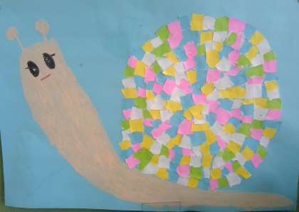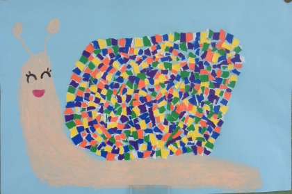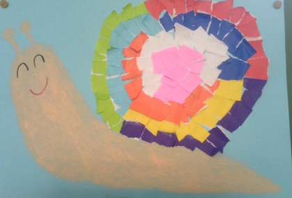 「ちぎって、はって」の作品です。折り紙をこまかくちぎって、かたつむりを作っていました。いろいろな柄のかたつむりがあってすてきです!