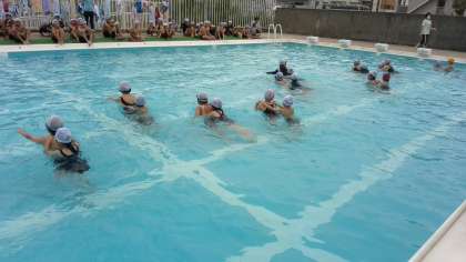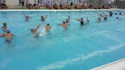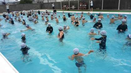 その後、プールの中で追いかけっこをしたり、1年生が6年生の肩につかまって浮いたりしていました。