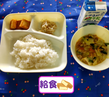 今日の給食では、焼いたあつあげにトウバンジャンの入ったピリ辛じょうゆをかけていただきました。