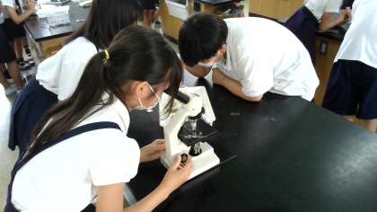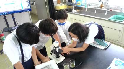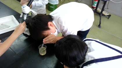 「どの辺りに生き物がいそうかな」と目を凝らしビーカーからスポイトで1滴水を取り、顕微鏡で観察しました。