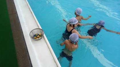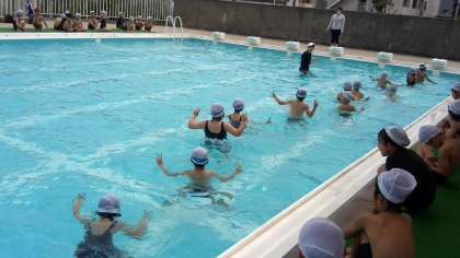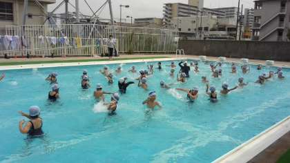 2年生は「ぞうさん」や「おじぞうさん」「かにさん」などになって水あそびを楽しんでいました。最後には、たからさがしをしました。
