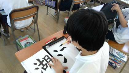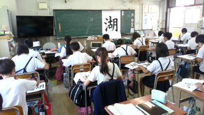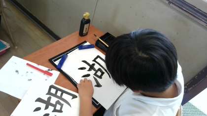 「湖」を書いていました。はじめはお手本をなぞって、その後お手本をよく見て書いていました。
