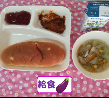 今日の給食では、ミートグラタンの中に、たっぷりの旬のなすが入っています。