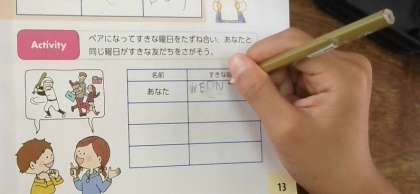 すきな曜日を英語でたずね合って、同じ曜日が好きな友だちをさがし合っていました。