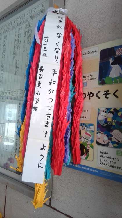おりづる集会で全校児童で折った鶴を、6年生が千羽鶴に仕上げてくれました。