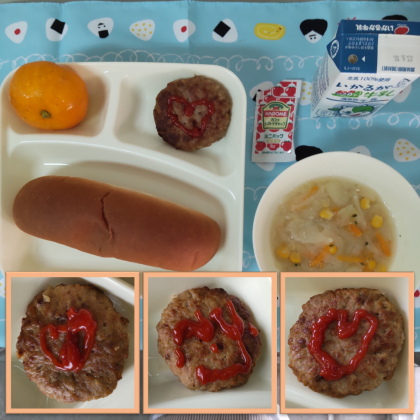 ケチャップでかわいい絵をかいてもらって、焼きハンバーグがますますおいしそうです!