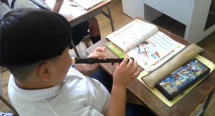 リコーダーで「アチャパチャノチャ」の曲をふいていました。
