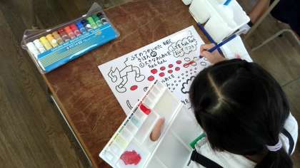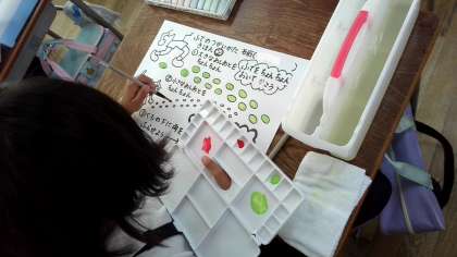 今日は、筆をちょんちょんとおいて、足あとをかいていました。