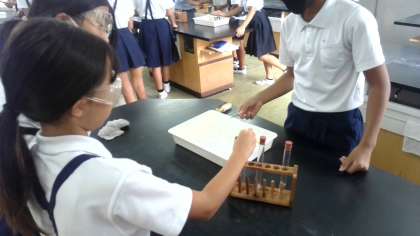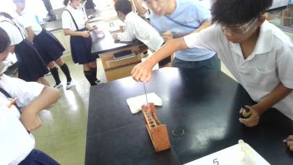 炭酸水にとけている気体を取り出して、線香を入れると消える実験をしていました。