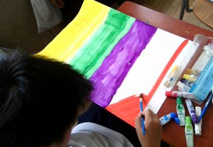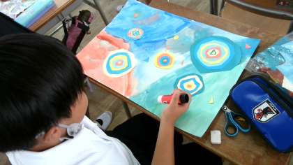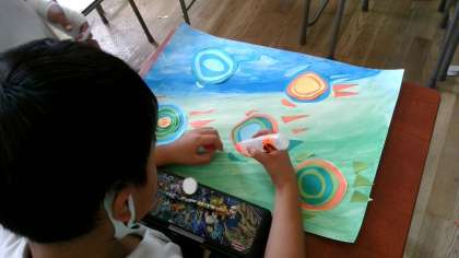 「タネから広がる色画用紙のもよう」の作品ができあがってきました。背景の色もきれいですね。