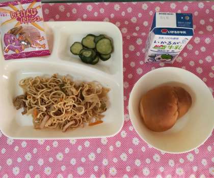 今日は、大人気の焼きそばに、口がさっぱりとするきゅうりのしょうがづけ!そして、はじめて登場の「いもけんぴフィッシュ」!