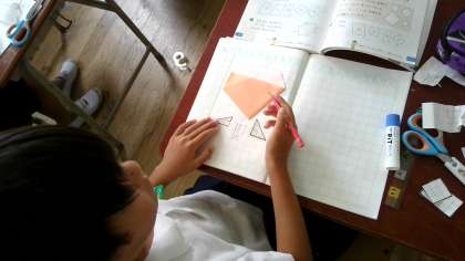 紙を折ったり、切ったりしてできた直角について調べていました。