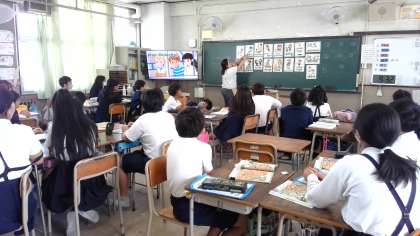 「I can run fast.」や「I can skate.」など絵カードを使いながら、