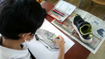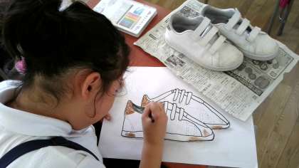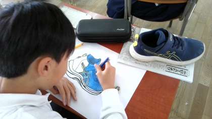 くつをよく見て、色えんぴつで色をぬっていました。