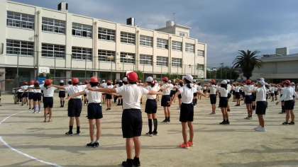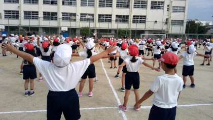 全校児童でラジオ体操の練習です。体育委員会の児童が前に出て、体操をします。