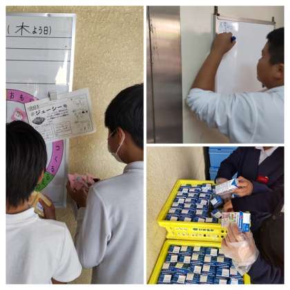 給食委員さんたちは、給食の放送や、牛乳箱の整理、献立黒板の記入など毎日大活躍!
