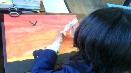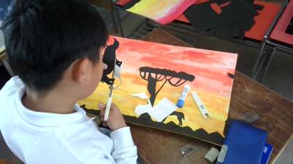 今日は、黒の色画用紙で動物や木、草などをカッターやはさみを使って作っていました。